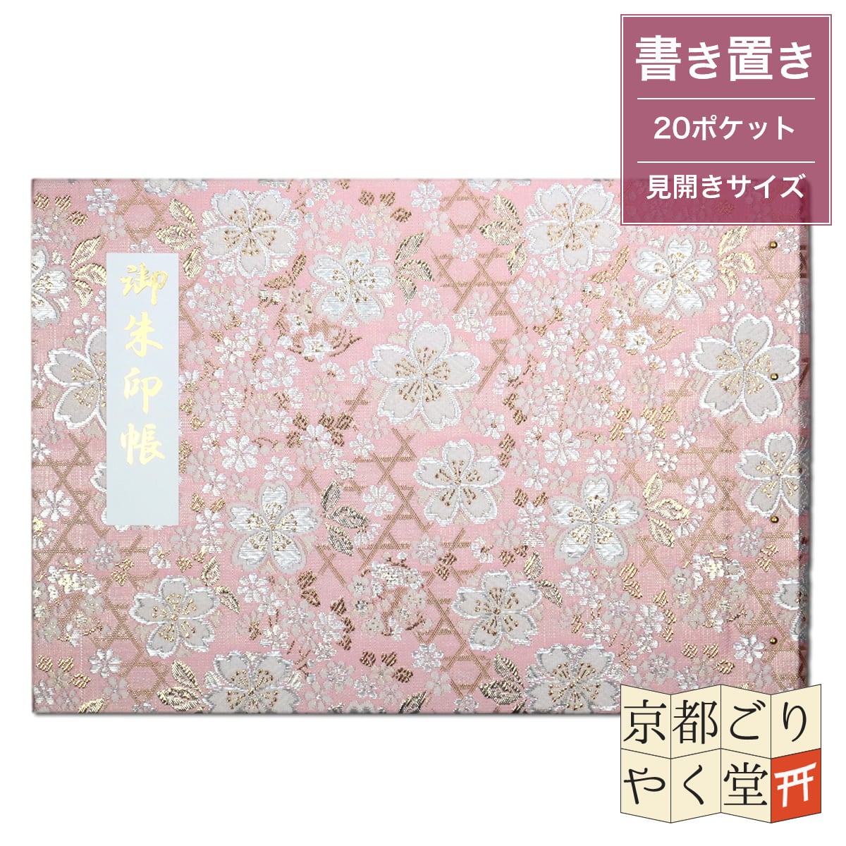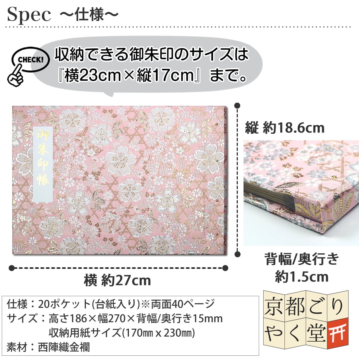 竹籠の編目を文様化した吉祥文様「籠目」と、大小の花々を配した華やかデザイン。落ち着いたピンク地に桜の花が優しく華やかな印象。金銀糸の輝きが美しい爽やかな一冊。籠目は厄除け、桜は豊かさや繁栄。