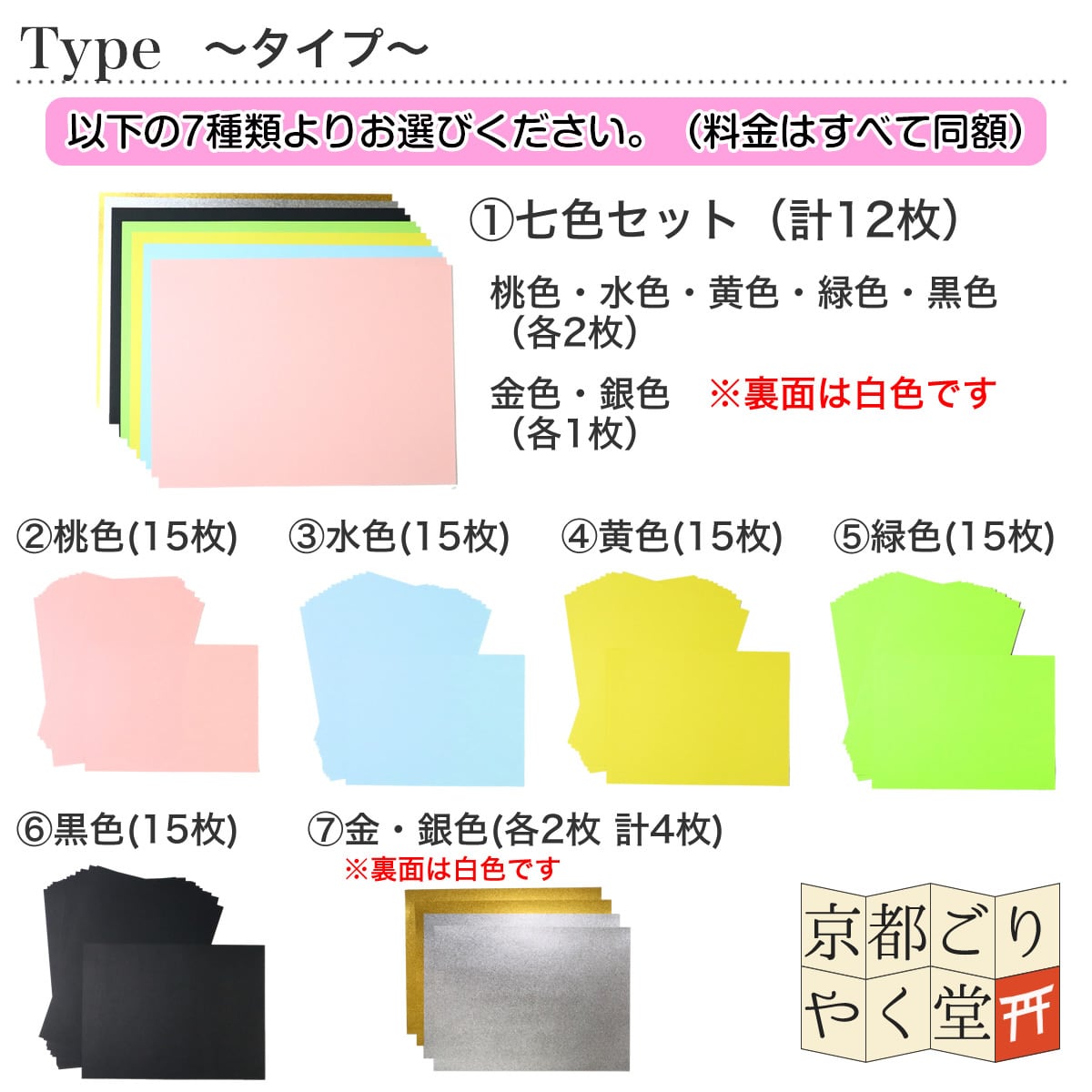 ◆七色セット(計12枚)・・・桃色・水色・黄色・緑色・黒色(各2枚)、金色・銀色(各1枚)