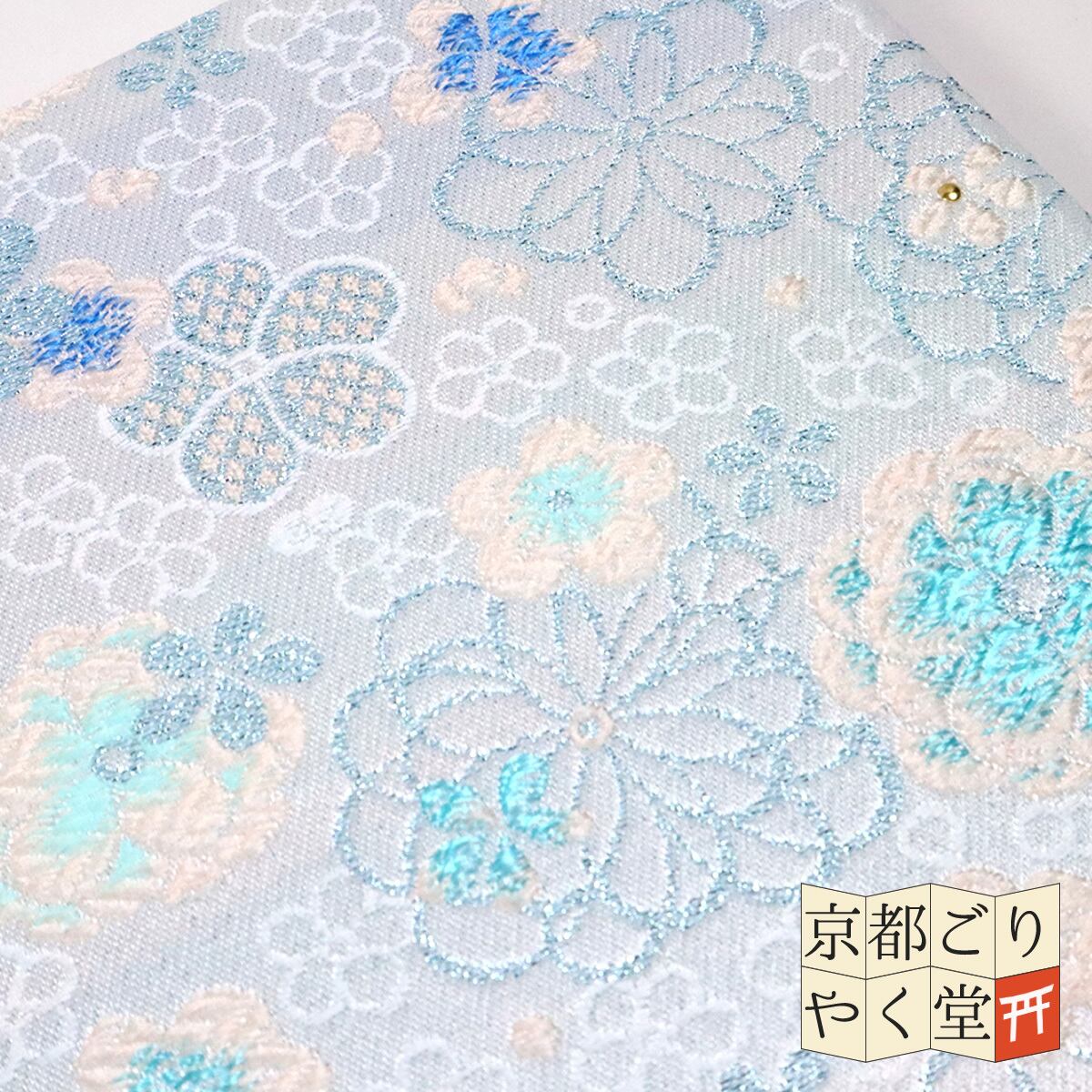 梅の花言葉である上品や高潔といったイメージと梅の花の可愛らしいザイン。全体的に清らかな色味で光が当たると花々に用いられている水色のラメ糸がキラキラと微細な輝きを放つ美しい一冊です。