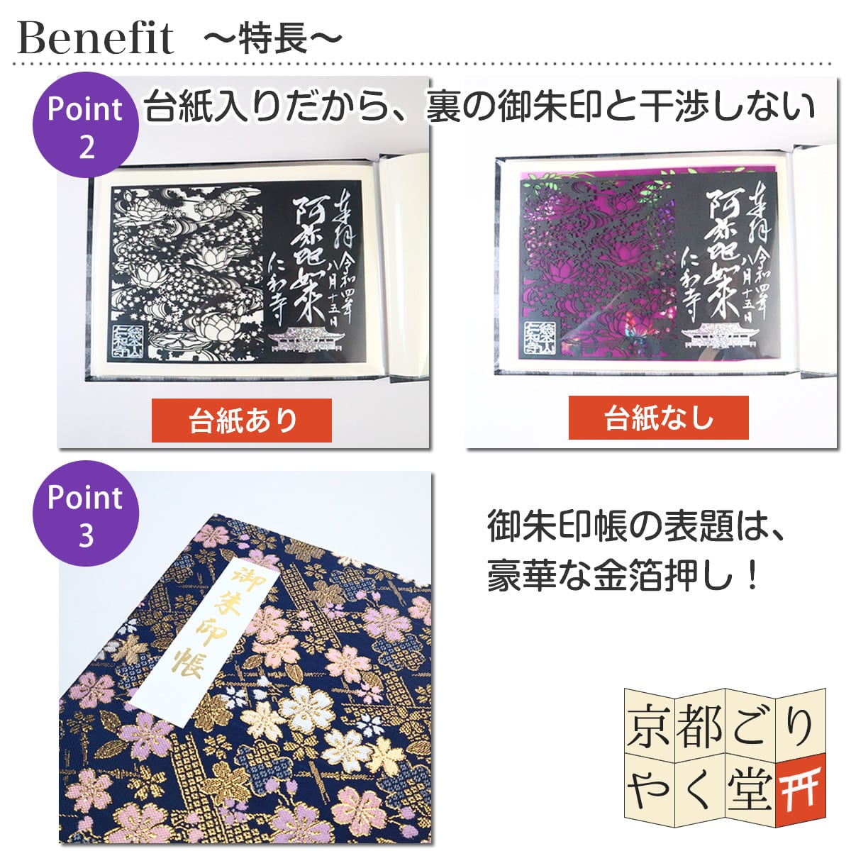 貼り付けないので、御朱印が汚れることもなく保管できます。大切な御朱印にハサミを入れたり、のりを付けたりするのはちょっと...という方におススメです。