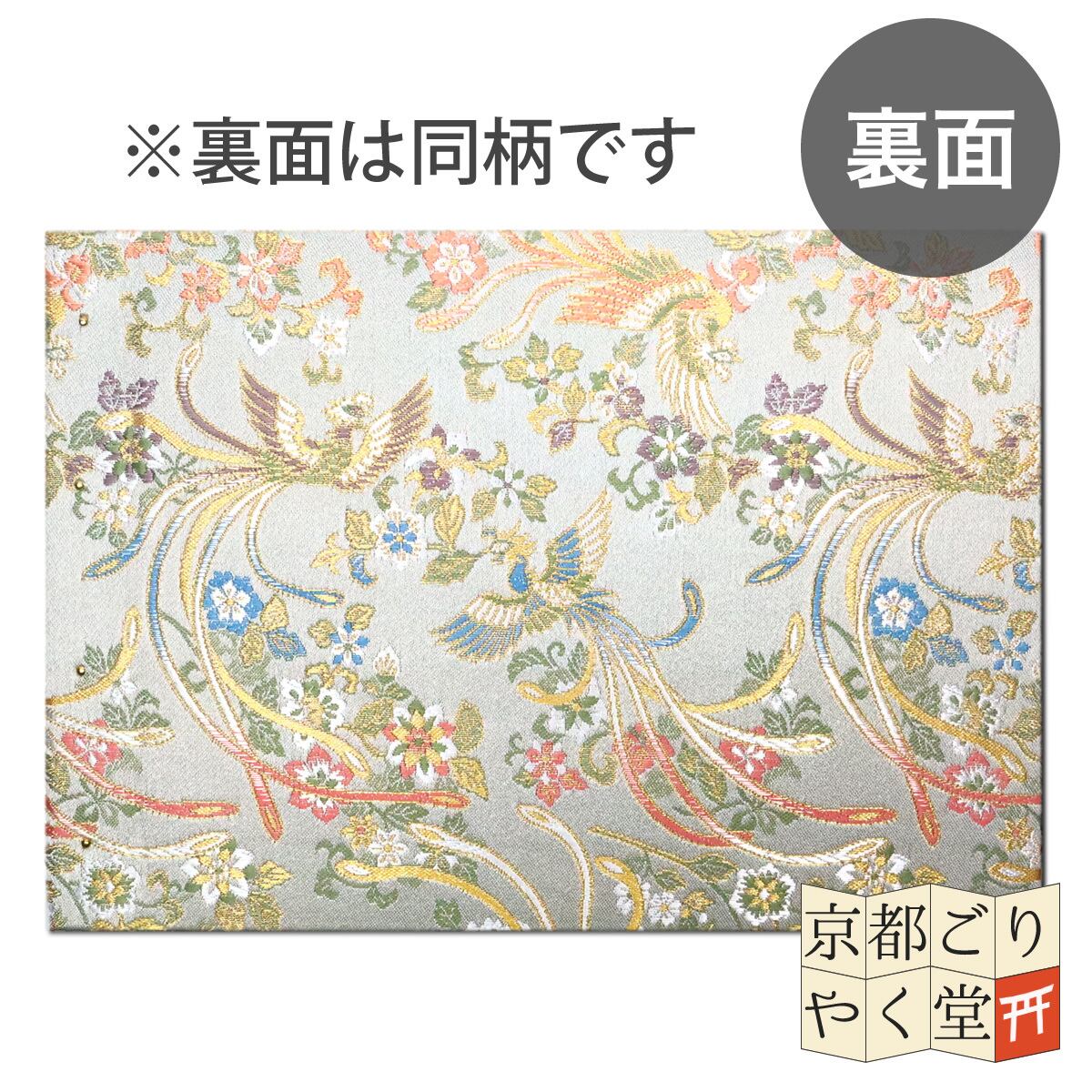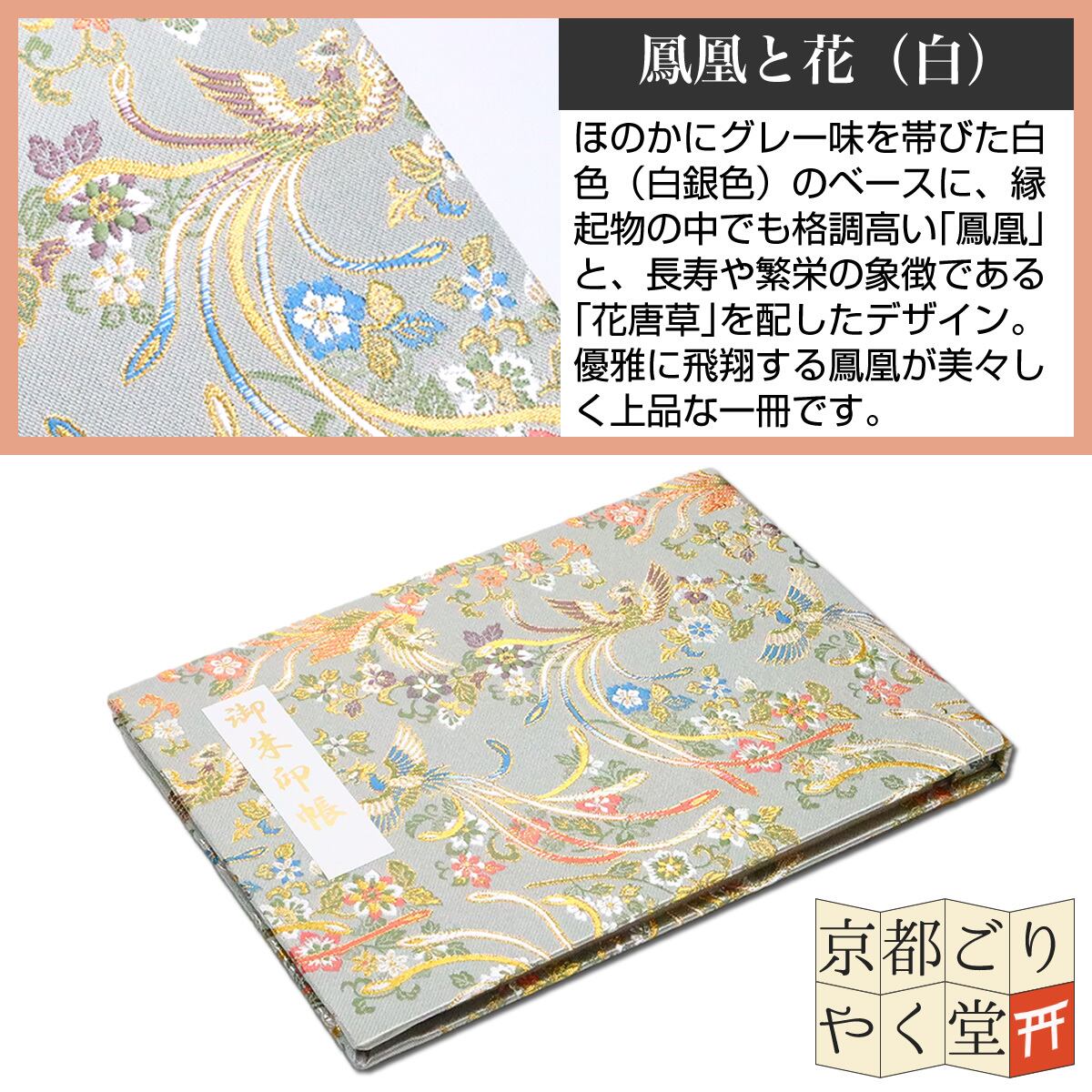 ほのかにグレー味を帯びた白色(白銀色)のベースに、縁起物の中でも格調高い「鳳凰」と、長寿や繁栄の象徴である「花唐草」を配したデザイン。優雅に飛翔する鳳凰が美々しく上品な一冊です。