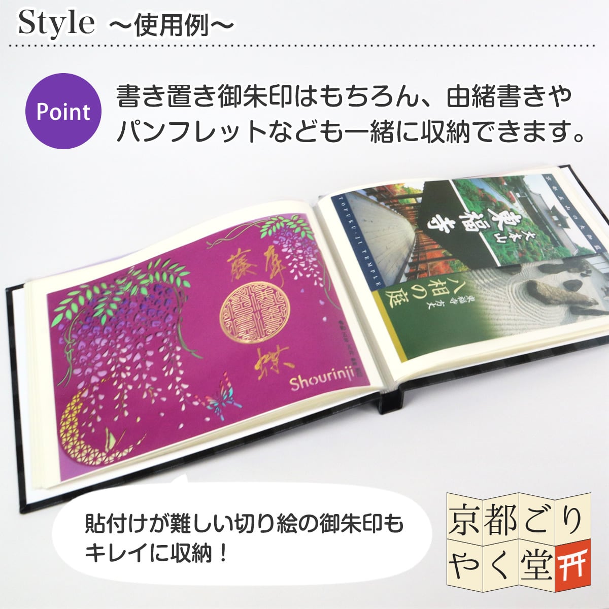 社寺のご朱印だけでなく神社の由緒書きやお寺のパンフレット、おみくじなども入れることができます。